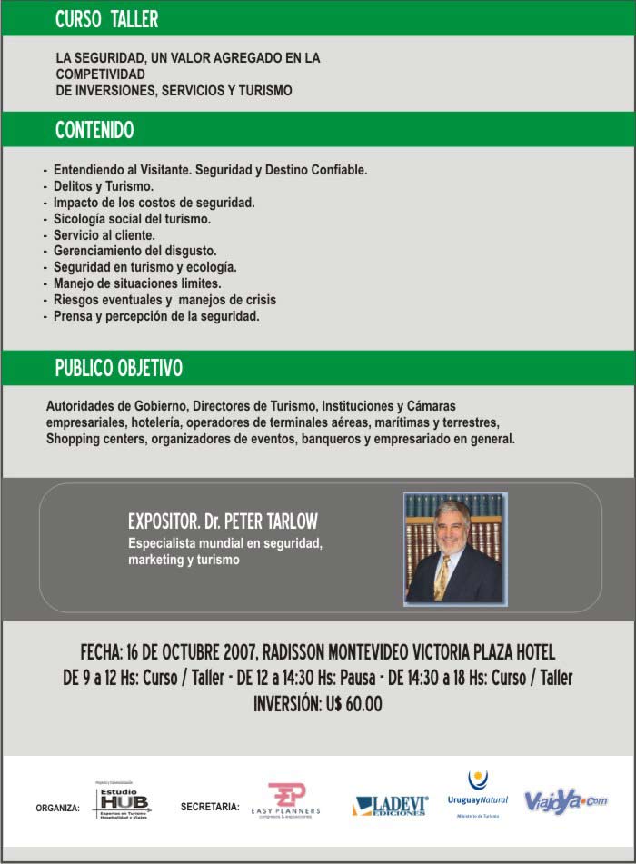 Con el acertado auspicio del Ministerio de Turismo, estará en Montevideo este experto mundial en Seguridad en Turismo, que ha llegado a preparar, en ocasiones, personal de la propia FBI.